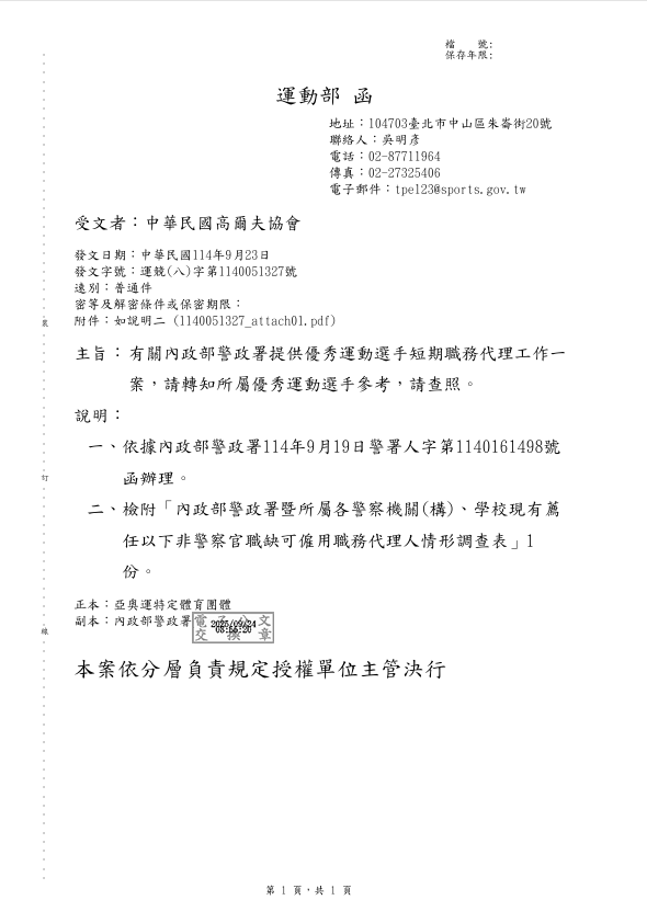 轉發-內政部警政署提供優秀運動選手短期職務代理工作