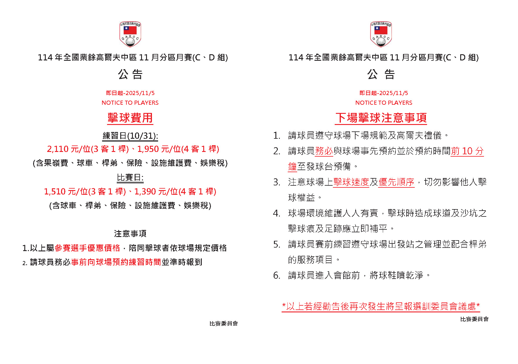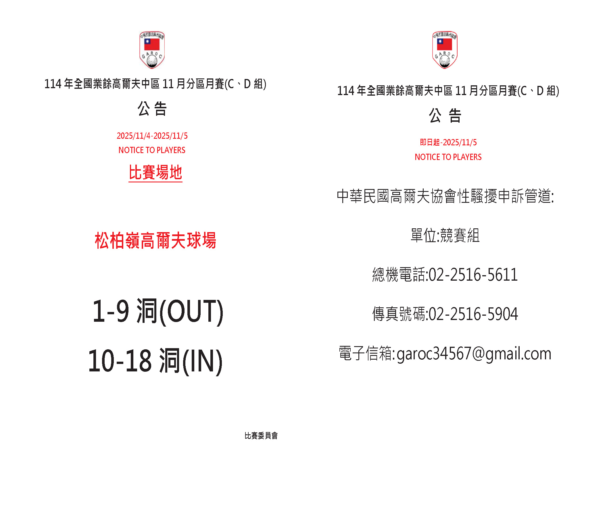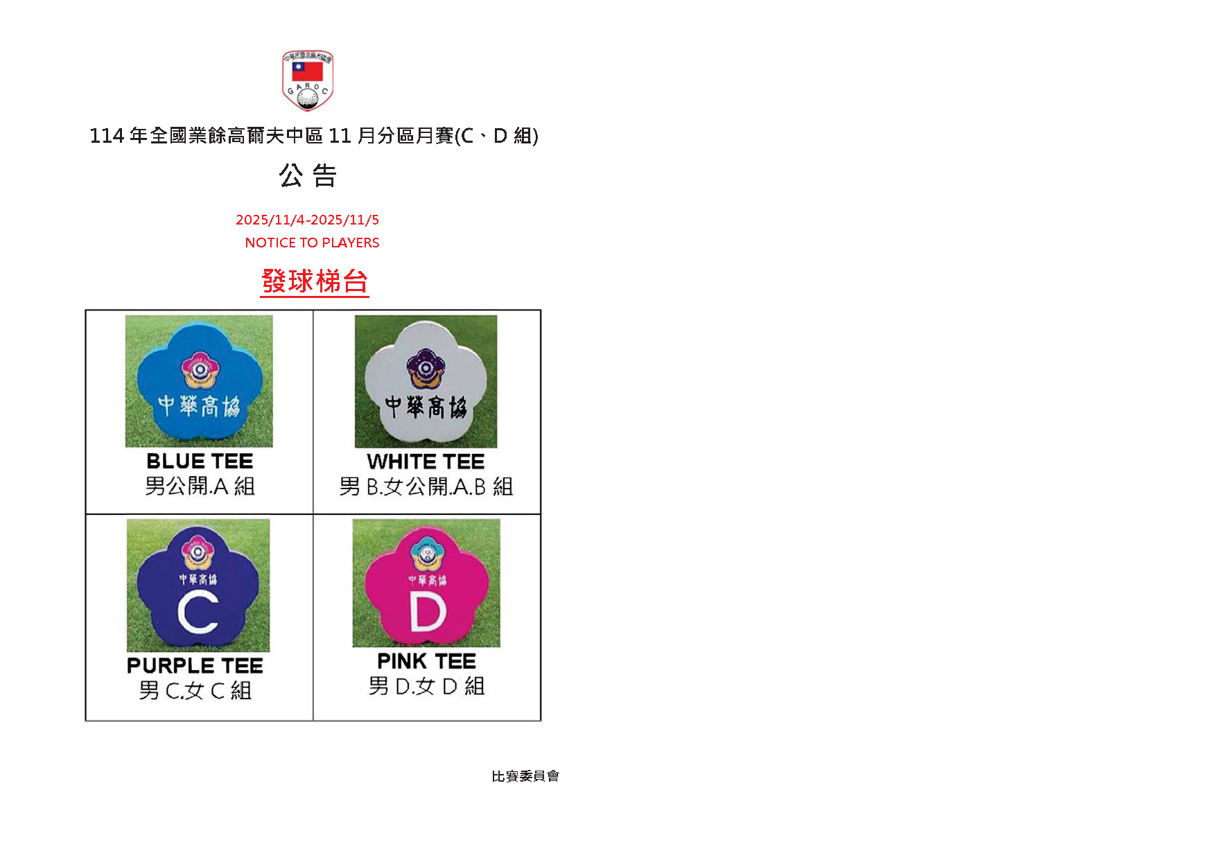 114年全國業餘高爾夫中區11月分區月賽(C、D組)-報名成功名單(10/16更新)