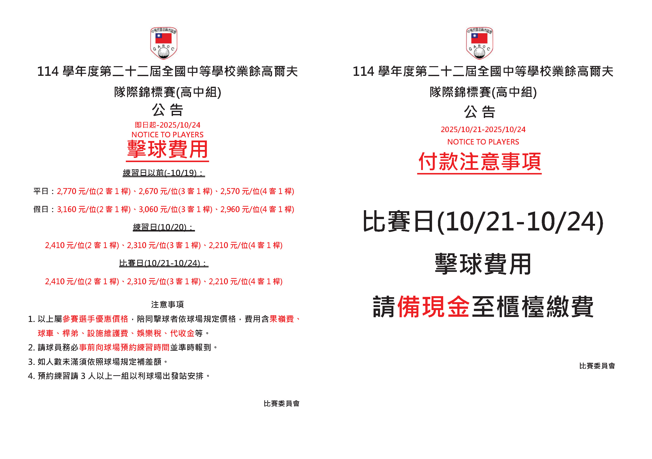 擊球費用.付款注意事項