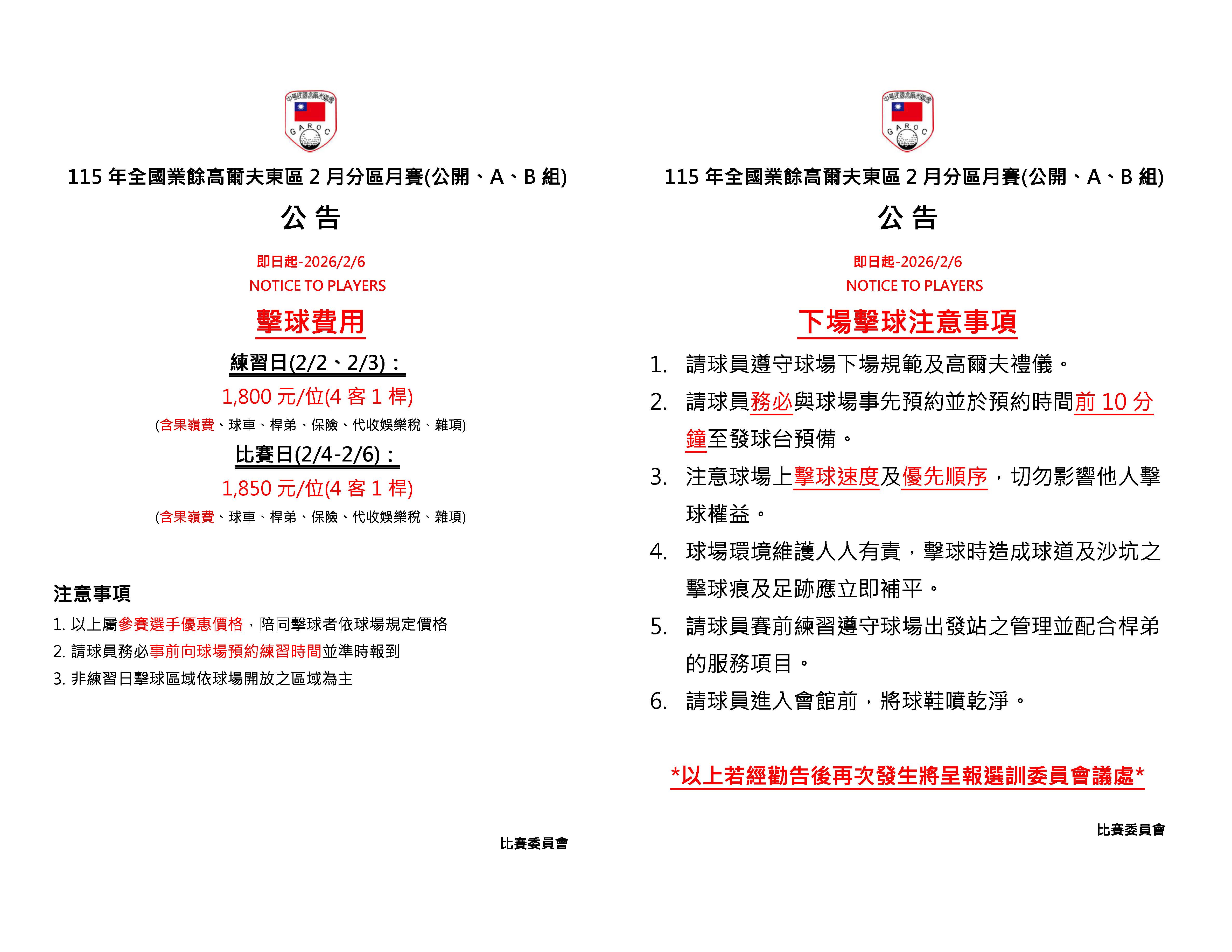 115年全國業餘高爾夫東區2月分區月賽(公開、A、B組)
