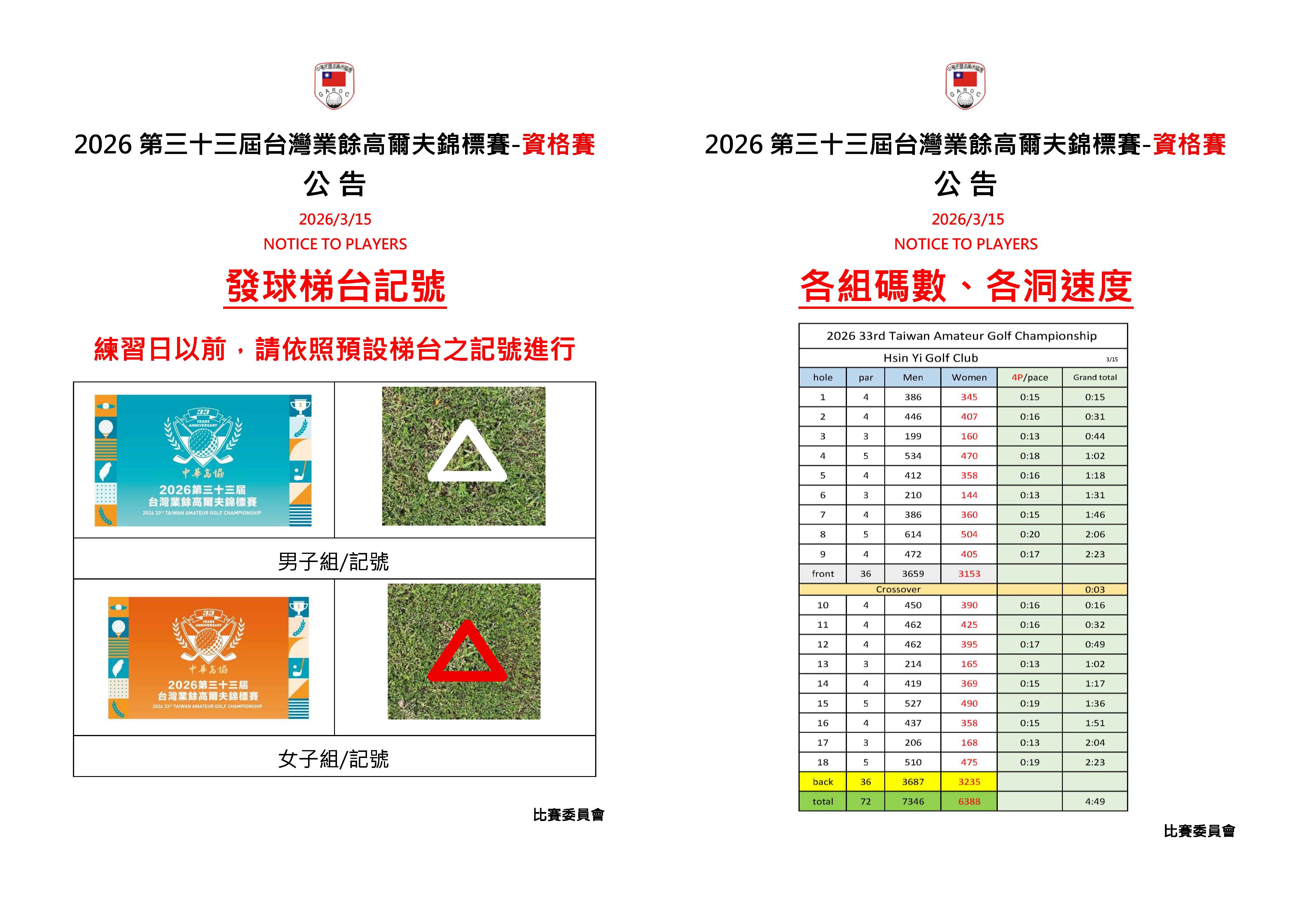 發球梯台記號、各組碼數、各洞速度