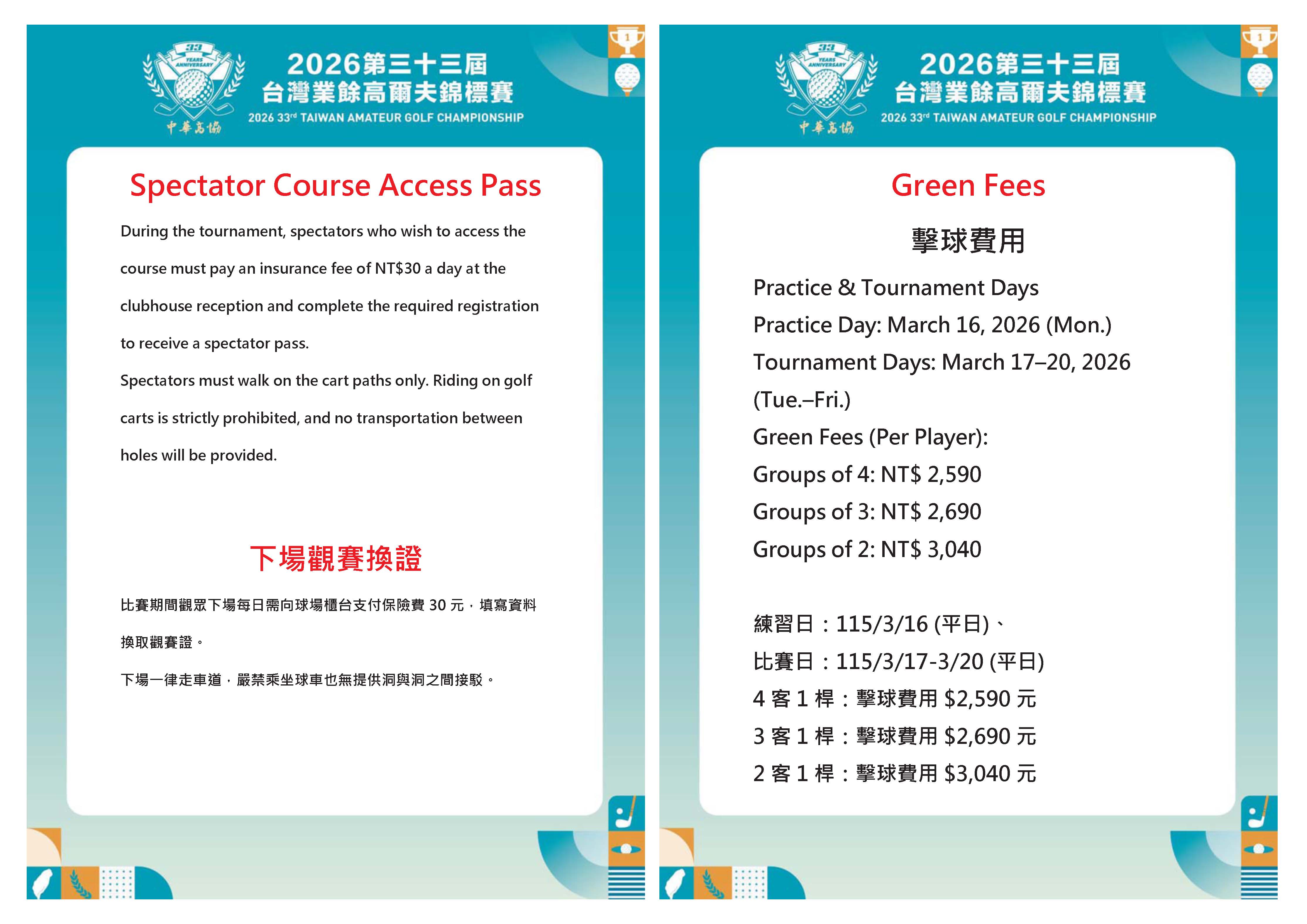 Spectator Course Access Pass、Green Fees