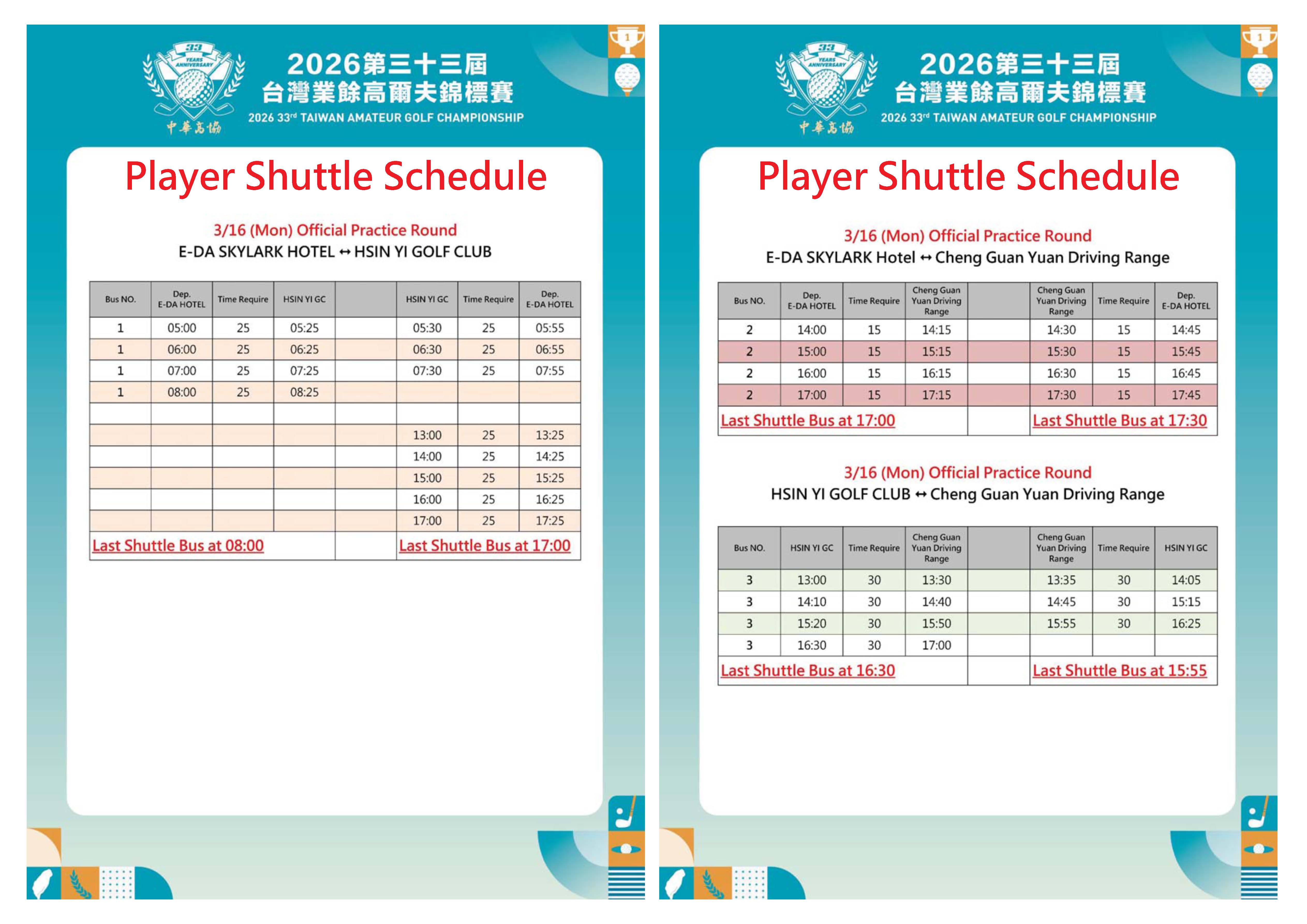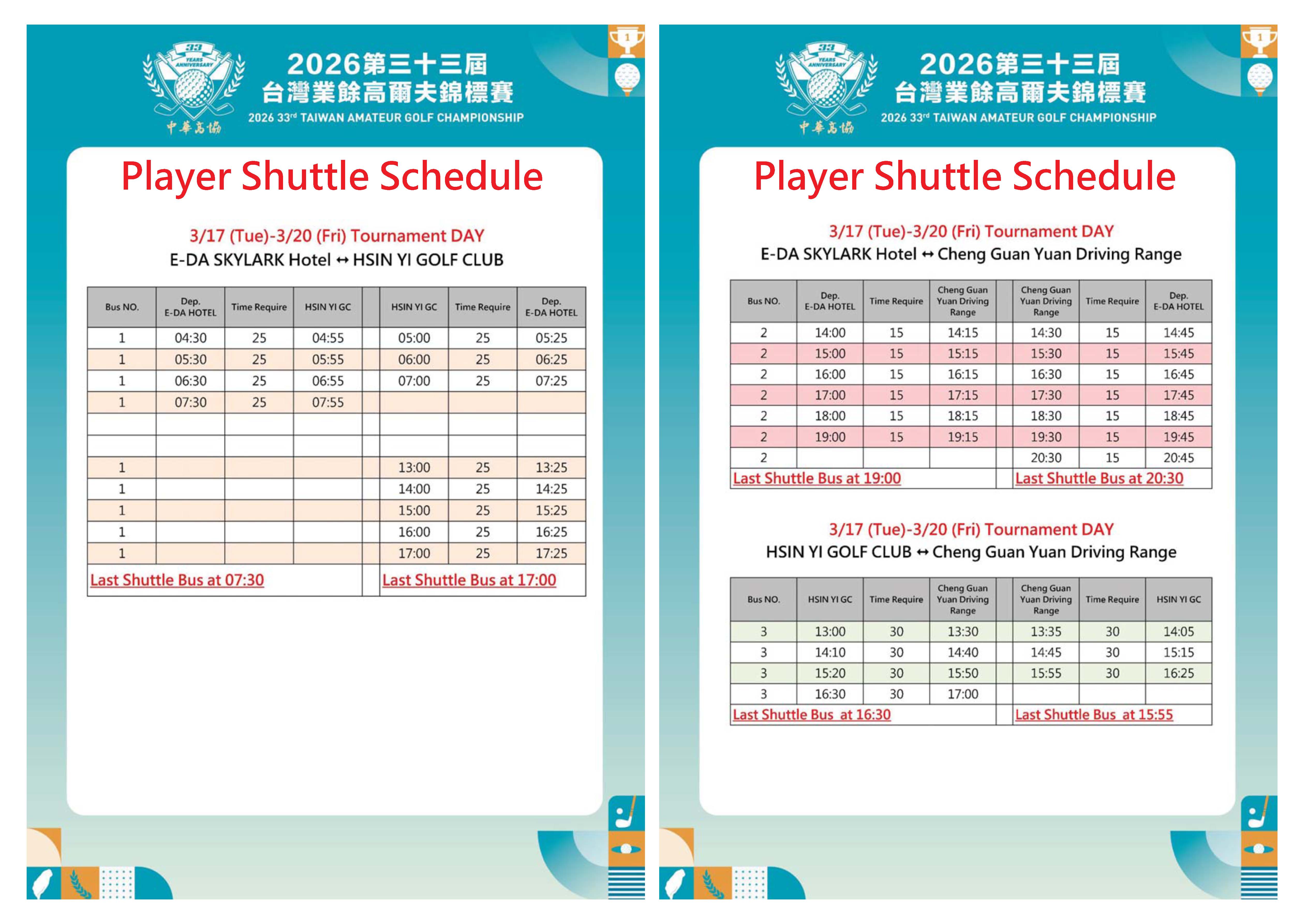 Player Shuttle Schedule 0317-0320 Tournament DAY